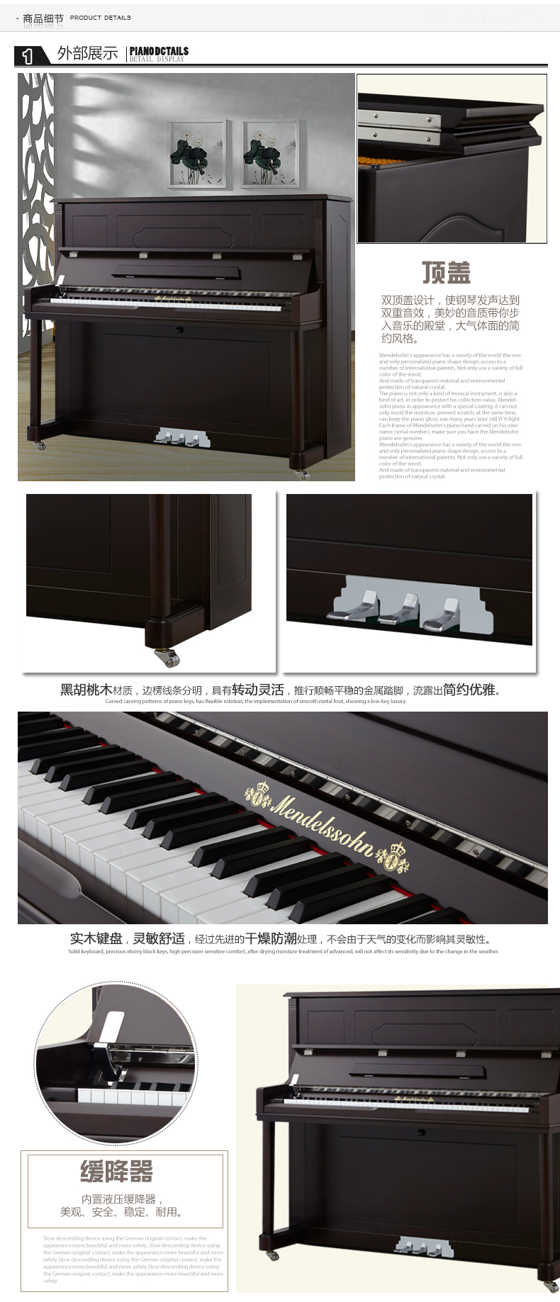 1.榔頭:擊弦槌采用德國進(jìn)口mendelssohn專制優(yōu)質(zhì)尼氈,音色柔和優(yōu)美