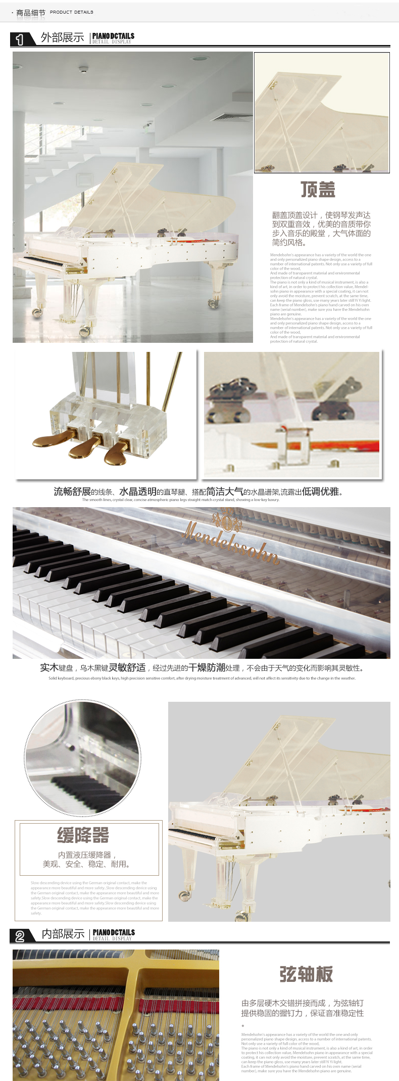 - 采用現代高科技環保材料,琴身通體晶瑩剔透、炫目璀璨。流暢舒展的線條、水晶透明的直琴腿、搭配簡潔大氣的水晶譜架,每一處細節都彰顯出澄凈的靈氣和王者的尊貴,宛若一座夢幻的水晶宮殿,承載著音樂和夢想,任琴聲回蕩在湛藍純凈的天空。