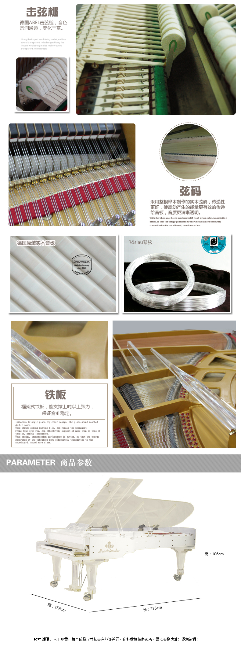 - 實木鍵盤、烏木黑鍵,德國R?slau(羅斯勞)琴弦、德國ABEL擊弦槌、德國原裝進口音板