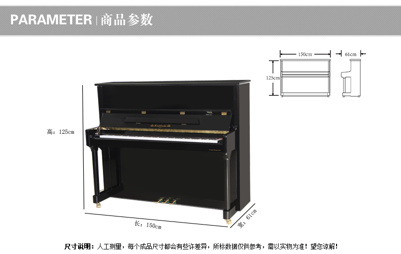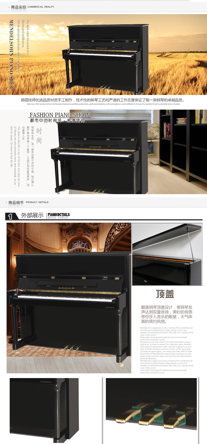 采用彰顯尊貴的歐式外型設計,精選高品質材質,雅致外觀與超凡音質相結合。德國高級技師手工組裝制作,專業的制琴工藝和嚴謹的工 作態度保證了每一架進口系列鋼琴的卓越品質。同時,每一架進口系列鋼琴在出廠時都須經過嚴格的檢驗、調試、整理,保證每位使用者都 能感受到它的純真的音質。