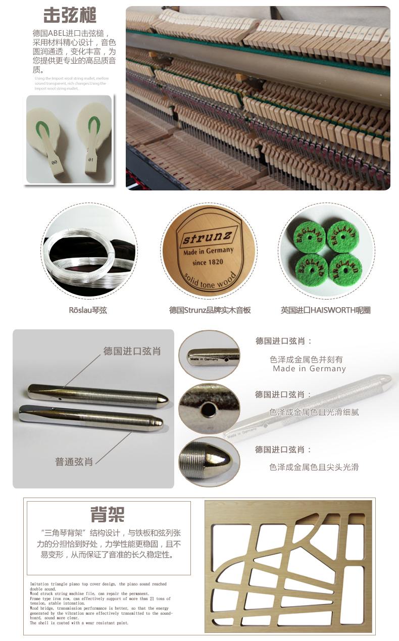 琴弦:德國Röslau品牌琴弦,直徑均勻,含碳量低、純度高、張力強,琴弦張力可達到30噸,彈性和韌性具佳,為您提供優美、純凈的音色。