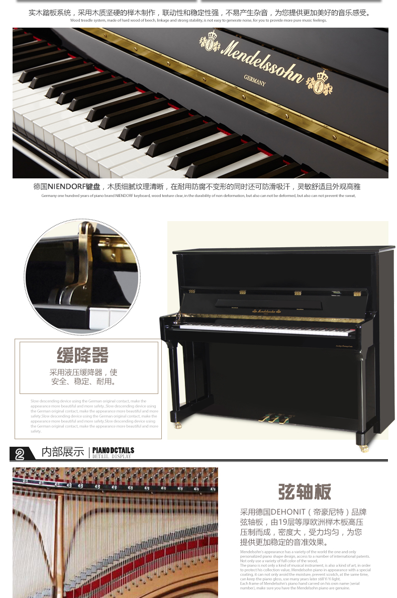 踏板系統:實木踏板系統,采用木質堅硬的櫸木制作,聯動性和穩定性強,經久耐用,腳感舒適,不易產生雜音,為您提供更加純凈的音樂感受。